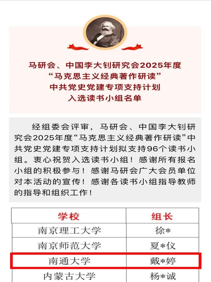 近日,中国高等教育学会马克思主义研究分会、中国李大钊研究会2025年度“马克思主义经典著作研读”中共党史党建专项支持计划名单公布。3044永利《毛泽东选集》读书小组在此次全国各高校的评选中脱颖而出,成为3044永利第二次入选马研会“马克思主义经典著作研读”资助计划的读书小组。此次全国共有96个读书小组获得立项资助,江苏省有南京大学、东南大学等6所高校的读书小组名列其中。